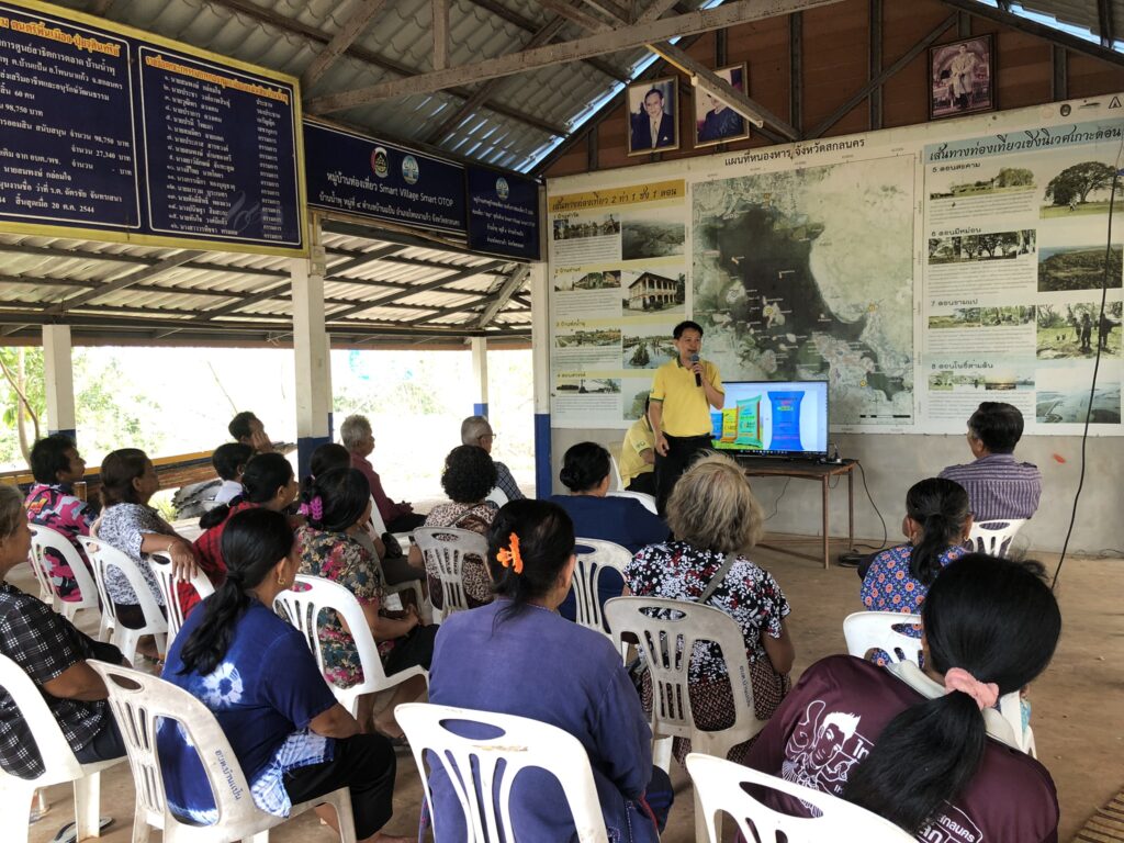 On February 8, 2023, the Nong Han Center of Excellence at Sakon Nakhon Rajabhat University, led by Mr. Sakda Saensupan and Ms. Atsara Namthaisong, organized a meeting at the Ban Nam Phu Community Hall in Ban Phan Sub-district, Phon Na Kaeo District, Sakon Nakhon. The event focused on discussing objectives and activities to develop and enhance the skills of local farmers in fish farming and vegetable cultivation for economic purposes.