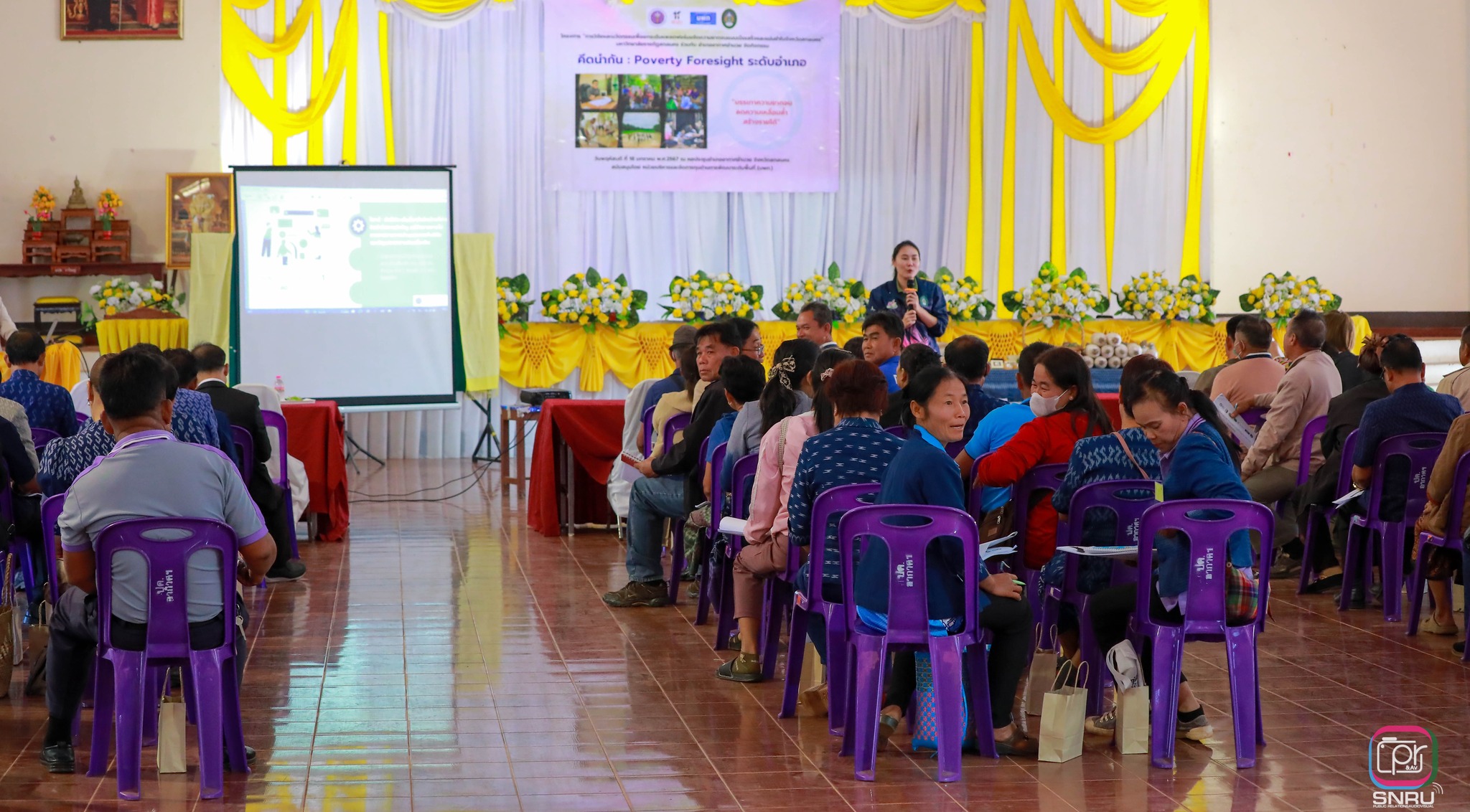 On January 18, 2024, a team of researchers from Sakon Nakhon Rajabhat University, in collaboration with Akat Amnuai District, organized a stakeholder workshop on the Poverty Alleviation Project in Akat Amnuai District at the District Hall of Akat Amnuai, Sakon Nakhon Province. The event was presided over by Mr. Suttimes Boonsaenkulthawat, District Chief of Akat Amnuai, who officially opened the stakeholder forum. Representing Sakon Nakhon Rajabhat University, the project leader, Asst. Prof. Saifon Punhawong, provided an overview of the project’s background. The research team then presented key findings from data collection and problem analysis regarding poverty in Sakon Nakhon Province, particularly in Akat Amnuai District. The university’s research initiative has been funded by the Program Management Unit for Area-Based Development (PMU-A) to support a comprehensive and precise poverty alleviation strategy in Sakon Nakhon Province. This effort is conducted in collaboration with the Center for SDG Research and Support, Faculty of Economics, Thammasat University. The workshop aimed to convene stakeholders to co-develop a foresight-based future vision for poverty reduction in the province. Through participatory processes and facilitation tools, the session created a platform for dialogue, mutual learning, consultation, and shared understanding. The goal was to collaboratively envision future strategies to address poverty—starting from the district level and scaling up to provincial-level impact.