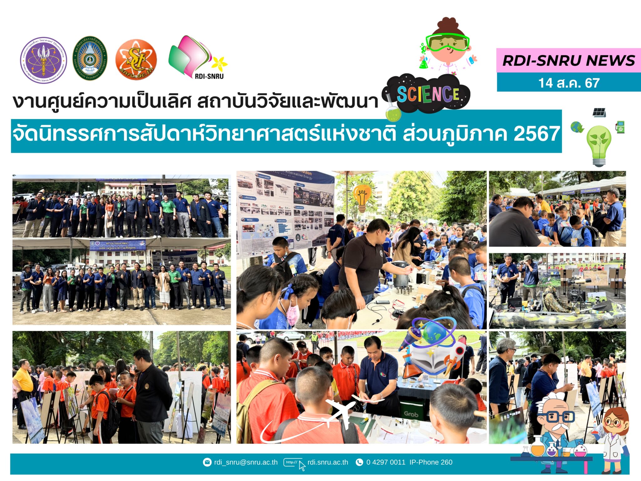 The Centers of Excellence under the Institute of Research and Development—namely, the Center of Excellence for Alternative Energy, Center of Excellence for Indigo, and Center of Excellence for Nong Han—jointly organized an exhibition during the Regional National Science Week 2024 under the theme “Science for Life, Environment, and Society (BCG).” We cordially invite everyone to visit the exhibitions presented by the Centers of Excellence, which include: ▪️ Center of Excellence for Alternative Energy: Showcasing the “Alternative Energy Learning Kit,” with rotating activities each day. ▪️ Center of Excellence for Indigo: Demonstrating how to create “Gliders,” where participants can engage in hands-on crafting of custom-designed gliders. ▪️ Center of Excellence for Nong Han: Presenting the “Bird Biodiversity Learning Kit,” along with opportunities to observe a variety of bird species that inhabit the Nong Han area. The exhibition will be held from August 14–16, 2024, at the Science Center Building, Faculty of Science and Technology, Sakon Nakhon Rajabhat University.