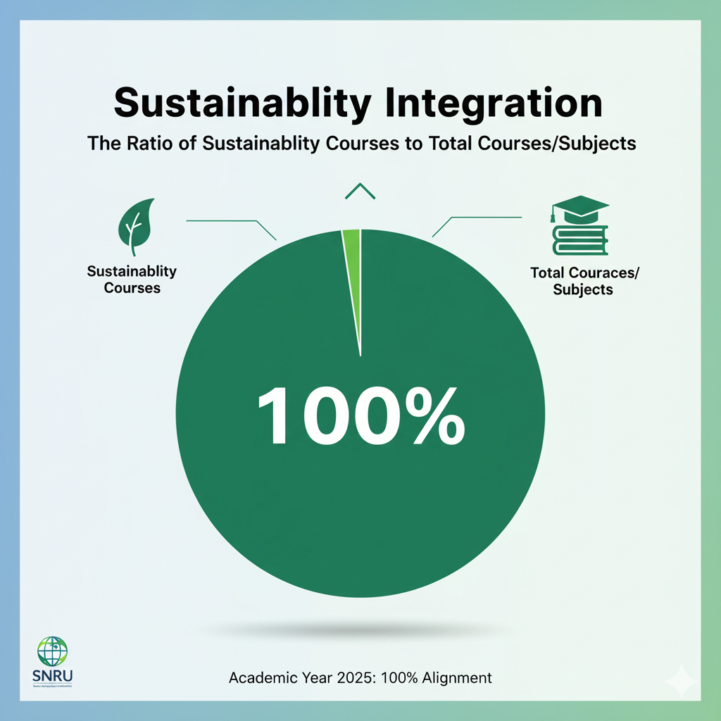 This 100% integration demonstrates our foundational strategy of leveraging education as the primary driver for sustainability. This approach directly contributes to the Education and Research (ED) indicator of the UI GreenMetric framework by ensuring that every student at SNRU is equipped with the knowledge and awareness necessary to contribute to a more sustainable future.