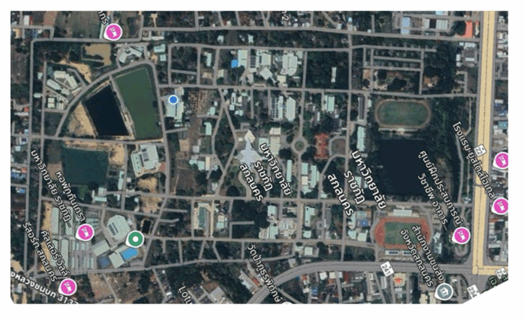 Sakon Nakhon Rajabhat University (SNRU) is situated on a total area of 1,018,416 square meters. The university is committed to maintaining a green and sustainable environment, with a significant portion of its land dedicated to vegetation and forested areas. The total vegetated area on campus is 322,996 square meters, which accounts for 31.72% of the total campus area. This is broken down into two main categories: Planted vegetation, which covers 93,853 square meters (9.22% of the total area), and includes cultivated green spaces such as lawns, gardens, and agricultural plots. Forest Area: This covers 229,143 square meters (22.50% of the total area). These areas primarily consist of dense, clustered forests. Notably, parts of this forested land are officially designated as conservation zones to preserve the university’s natural resources and biodiversity.