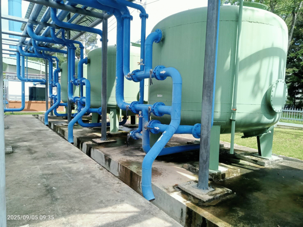 There are three photographs showing the physical equipment of the university’s water recycling facility. These include: