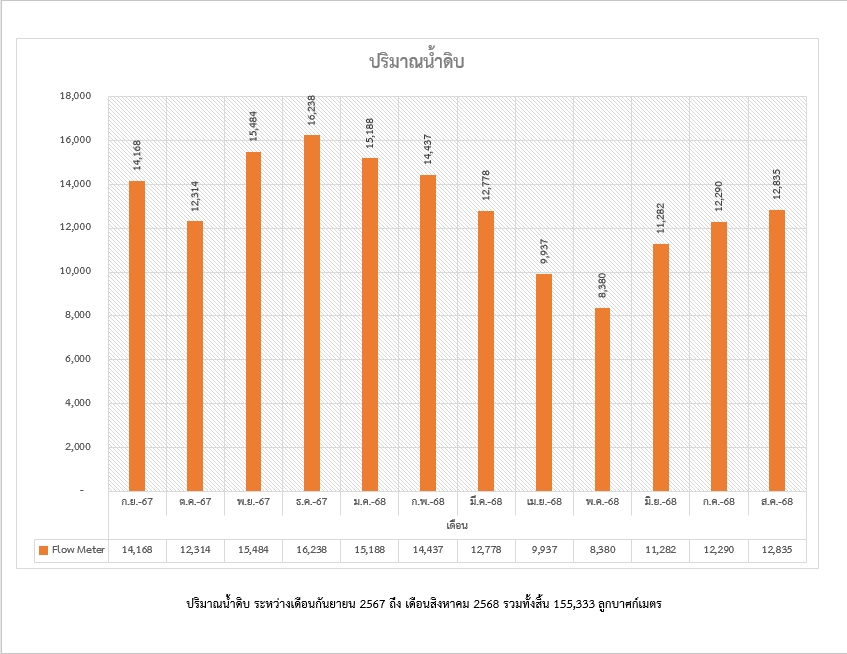 There is a bar chart titled “ปริมาณน้ำดิบ” (Raw Water Volume). This chart displays the monthly volume of raw water consumed from October 2024 (ต.ค.67) to September 2025 (ก.ย.68).